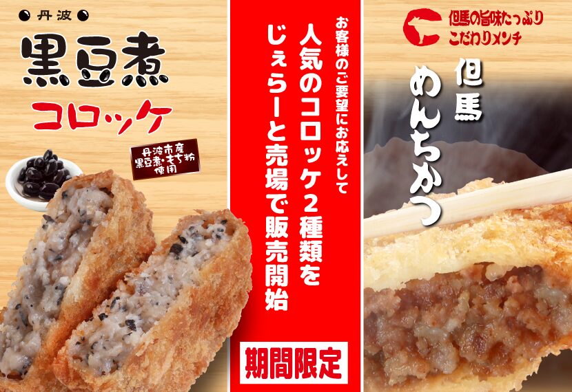- 丹波黒豆煮コロッケ:220円・・・丹波特産の黒豆を贅沢に使用した、おば里自慢の逸品です。